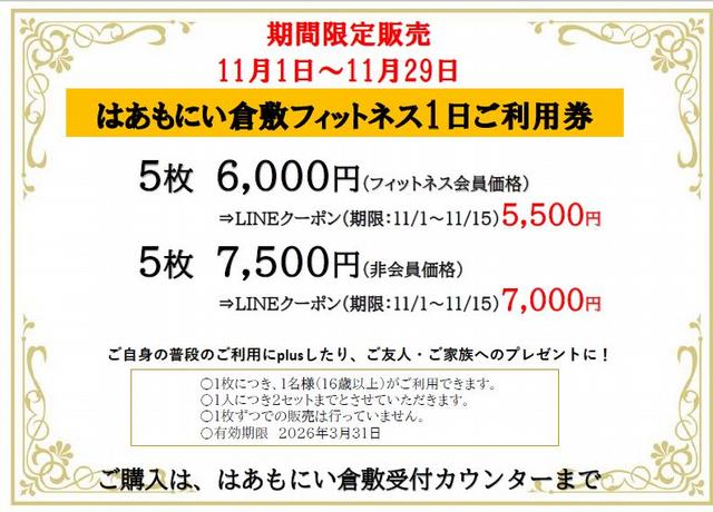 2025.10.06 フィットネス1日ご利用券を期間限定で販売します!